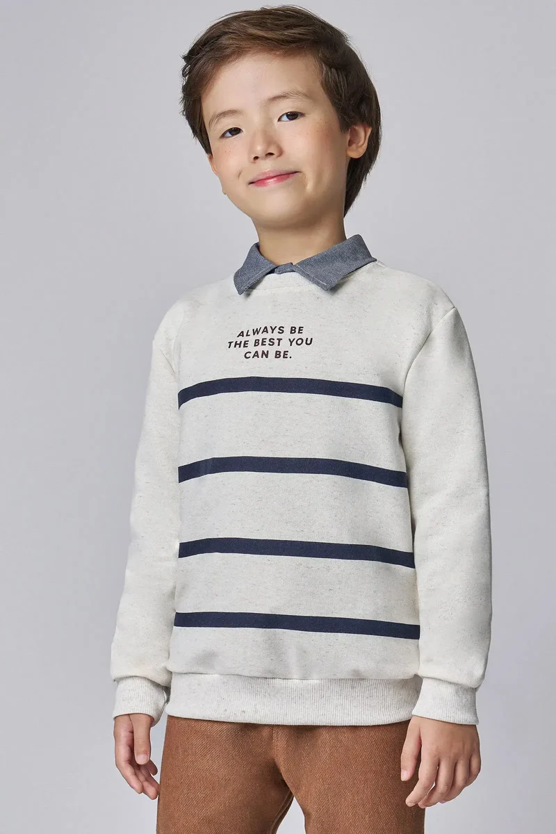 Um blusão pensado para acompanhar os meninos em todos os momentos, do passeio em família às brincadeiras cheias de energia. Confeccionado em moletom sem pelúcia, ele oferece conforto na medida certa, com toque macio e leveza ideal para dias amenos. Disponível nas cores bege e marinho, o modelo traz listras horizontais modernas e estampa frontal com mensagem inspiradora, criando um visual casual e cheio de personalidade.