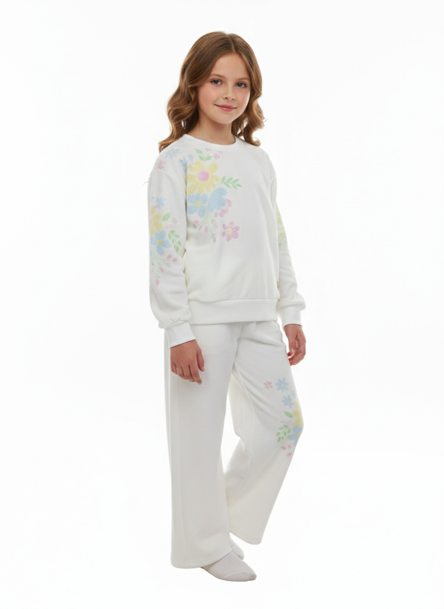 Um jardim de inverno particular para a sua pequena! O conjunto Flowers da Livy é a união perfeita entre a elegância do off-white e a delicadeza das flores em tons pastéis. Confeccionado em moletom de alta qualidade, este conjunto foi desenhado para proporcionar um visual iluminado e sofisticado, sem abrir mão do conforto e do aquecimento necessários para as estações mais frias do ano.