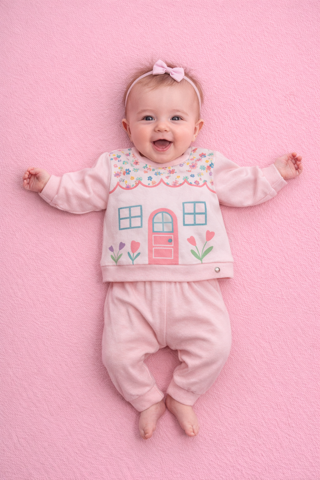 Um conjuntinho que parece saído de um livro ilustrado, onde cada detalhe conta uma historinha cheia de carinho. Em tom rosa suave, a blusa traz a estampa delicada de uma casinha com janelas, porta e florezinhas coloridas ao redor, criando um visual lúdico e encantador. A calça em malha felpuda complementa o look com conforto absoluto, formando uma combinação perfeita para aquecer com leveza e muito charme.