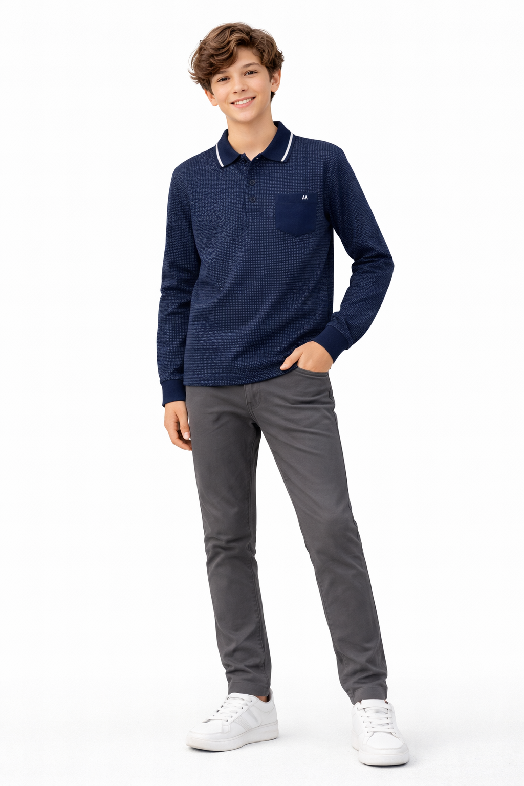 a camisa polo de manga longa traz modelagem moderna, gola com acabamento contrastante e fechamento por botões. o detalhe do bolso frontal valoriza a peça e adiciona um toque sofisticado ao visual.