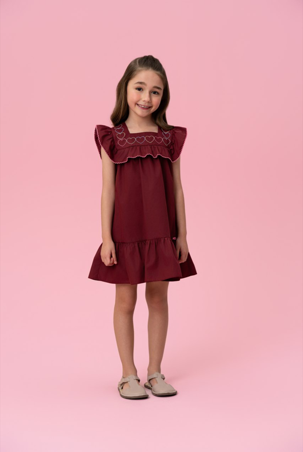 Um vestido que parece ter saído de um conto delicado, onde cada detalhe conversa com o charme da infância. Em tom bordô intenso, o modelo traz bordados de corações no busto e mangas amplas com acabamento ondulado, criando um visual romântico e sofisticado na medida certa. A modelagem soltinha com babado na barra proporciona movimento suave e conforto para acompanhar cada passo com leveza e elegância.